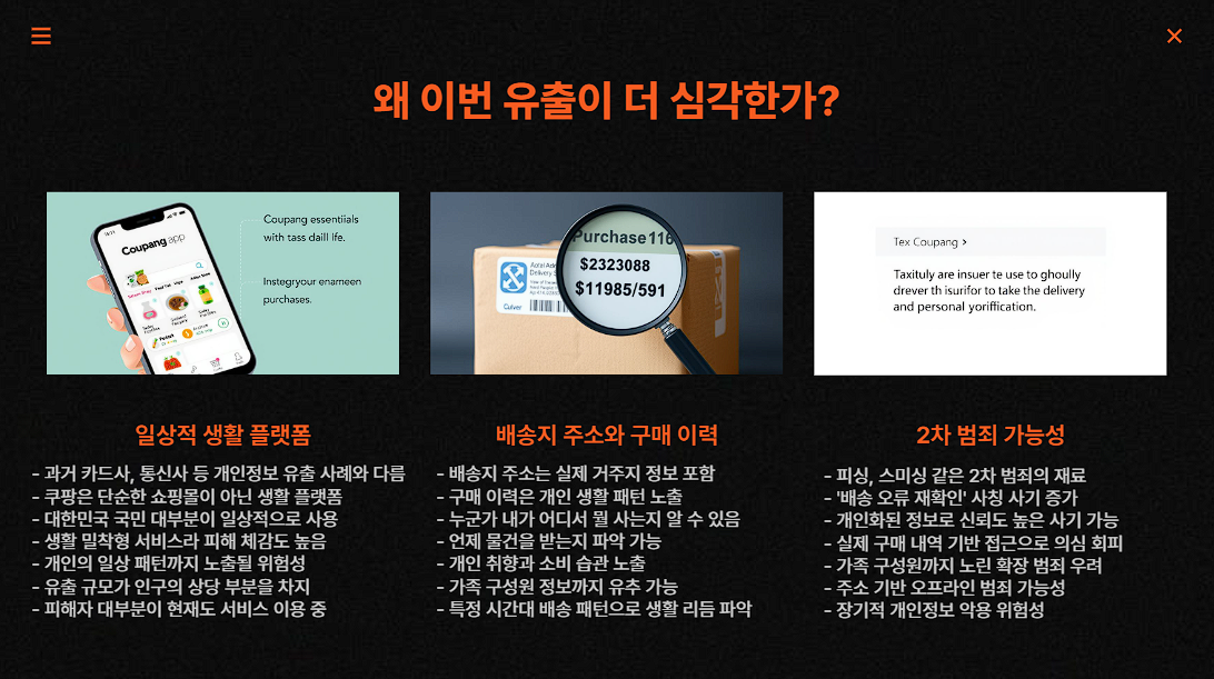 구매 패턴, 주소, 전화번호 등은 단순한 개인정보를 넘어 피싱과 사칭 범죄의 출발점이 되기도 합니다. 실제로도 “쿠팡 배송 오류 안내” 같은 메시지가 유출자들에게 먼저 도착하고 있다고 하죠.